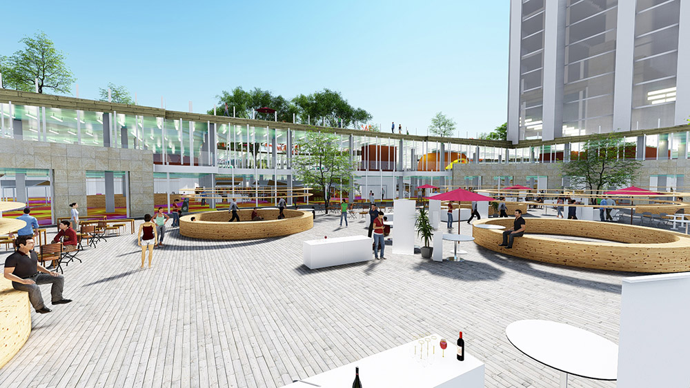 In order to increase the efficiency of the work areas, open courtyards within the canyon space were designed to penetrate natural light, vegetation and create immediate contact between the work areas and the outside. In addition, the desolate roof areas were designed to constitute available outdoor spaces and will form a continuum with the work and office areas on the second floor of the mall.