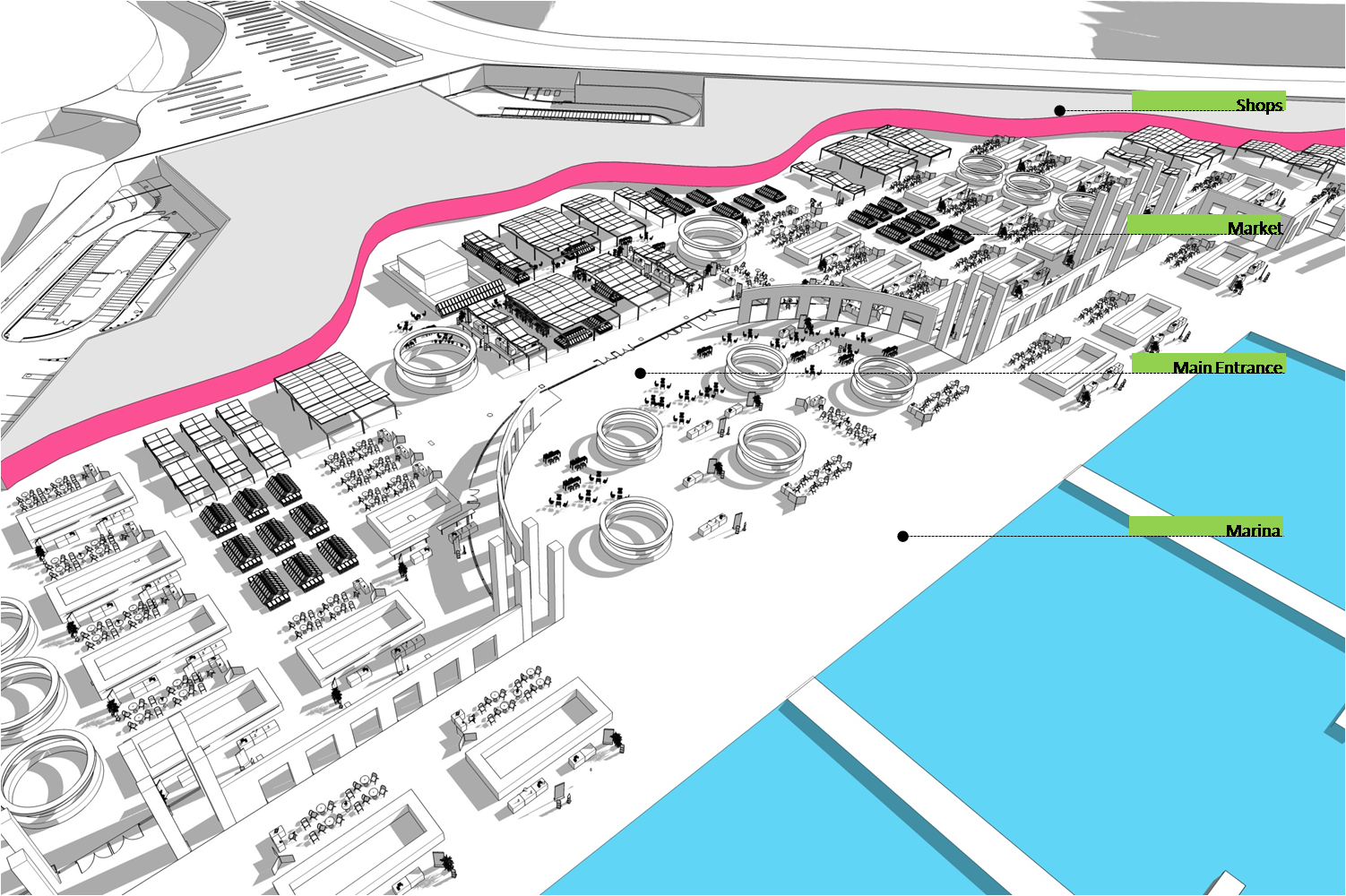 The Arena project chooses to emphasize an open relationship with the sea, marina and boardwalk. This project is an attempt to redefine the existing Arena Mall in Herzliya Pituah. The structure of the shopping mall located at the front of the marina, with residential towers and a hotel, asks for a renewed definition which matches the changes in the patterns in the area. Our proposal for the building includes transforming significant areas into high-tech employment areas on the upper floor, and turning the commercial areas on the lower floor into an up-to-date, multi-purpose market, based on open stands and exhibition spaces and less traditional shops.
