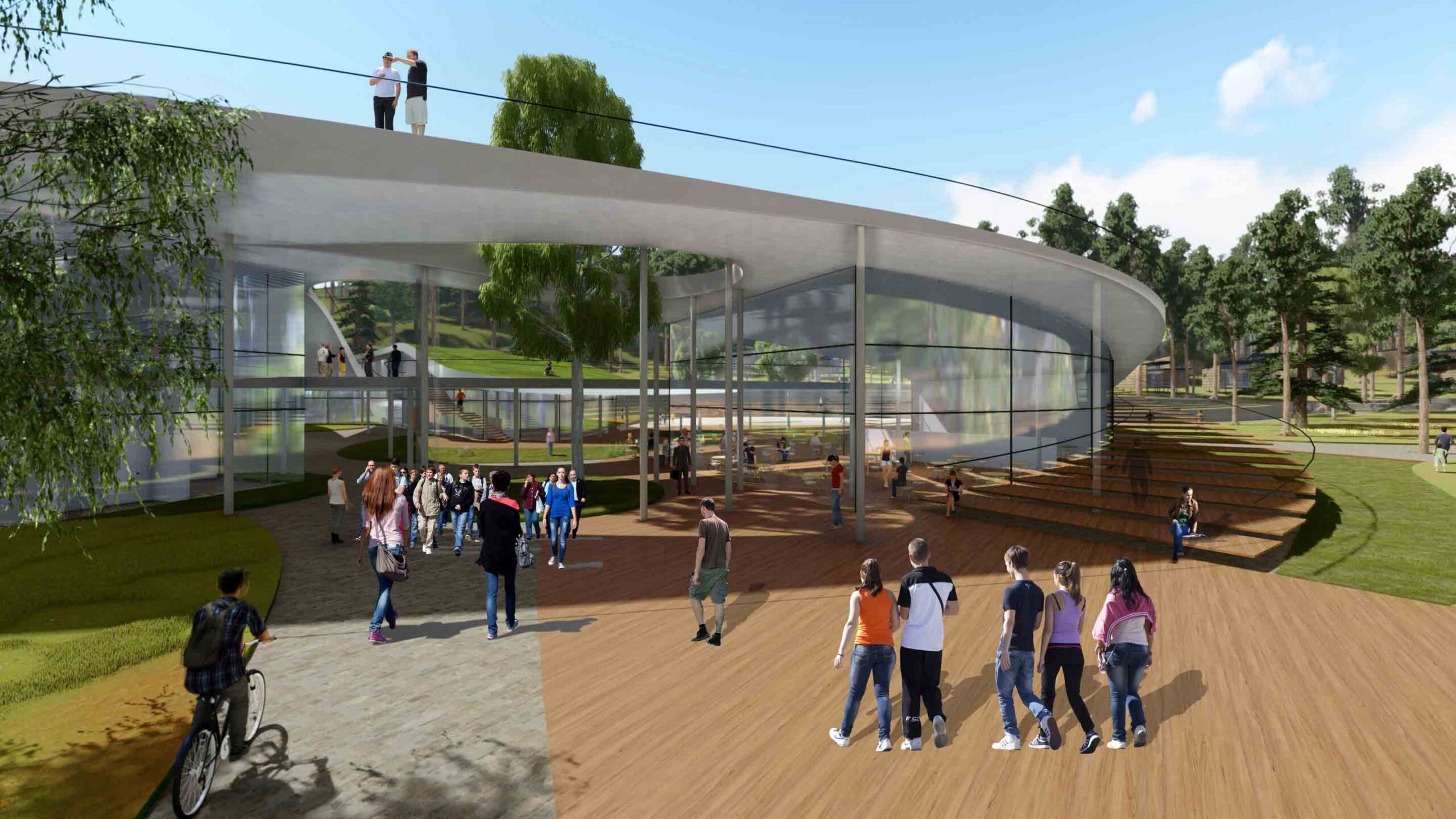- Addressing the topography of the site as an advantage for creating a continuum between the roof of the building, the residential units and the grove that allows circulation that links the various functions on campus.