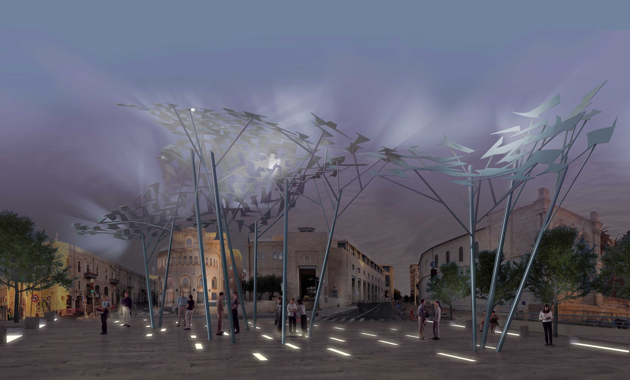 Tzahal City Square is a unique meeting place of the old city of Jerusalem on Jaffa street: the ancient road connecting Jerusalem with the west. The square is a junction point of the old and the modern city, past and present layers and diverse cultures. This sensitive place of multi-cultural experience is seeking a spirit of freedom, reconciliation and brotherhood. The sculpture, “Free Spirit”, suggests a connection between people and meaningful places. The installation highlights our temporary existence in this world, and the transience and fragility of our being. The recognition that a light gust of wind, both in the physical and human aspect, can determine individual’s and society’s unique culture and history, strengthen the importance of seeking to create an island of tolerance, a place of peace and an area of acceptance and recognition of the other.