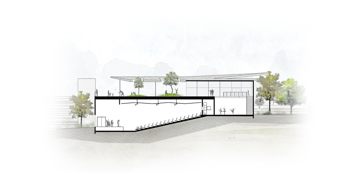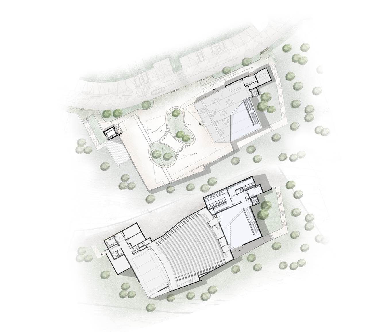 The buildings levels are adjusted to the topography of the site and are integrated into the landscape. They create a continuum between the roof of the auditorium building and the level of the upper access road and enable high access to the building and to the observation deck. Creating a Using the topography to place most of the building below street level reduces the concealment of the landscape and frees open spaces in its surrounding area including on the street level.