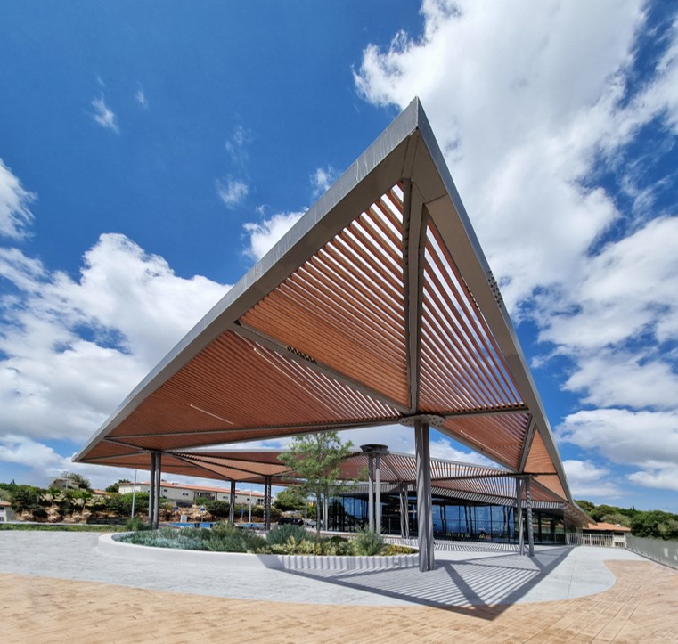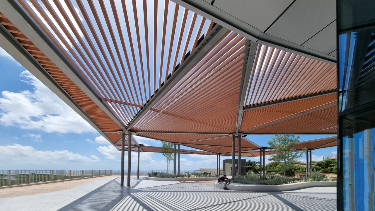 The site can be seen from many directions; therefore, all the facades of the building are designed to be viewed, including the fifth facade (the roof), while the design of the facades is inspired by the limestone rocks of the Carmel. The unique location of the project enables the framing of the natural landscape and the sea, making them an integral part of the building. The observation deck with its integrated vegetation strengthens the connection to nature. Combining “islands” of vegetation and trees is complementary to the cantilevered roof at the entrance. It creates shade and a pleasant environment for visitors, as well as strengthens the presence of nature.
