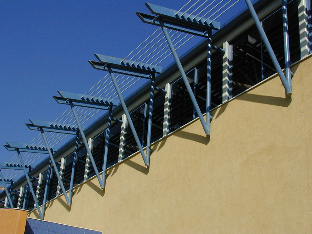 The forms, the colors and the partly disharmonious openings on the facades create an atmosphere of joy, motion and youthfulness. Located on a High-School campus, it serves the students and the community. It is a pleasant place for meeting, playing, socializing and enhancing the connections among people in the neighborhood. It is architecture that pays tribute to the casual side of life in all its human aspects.
