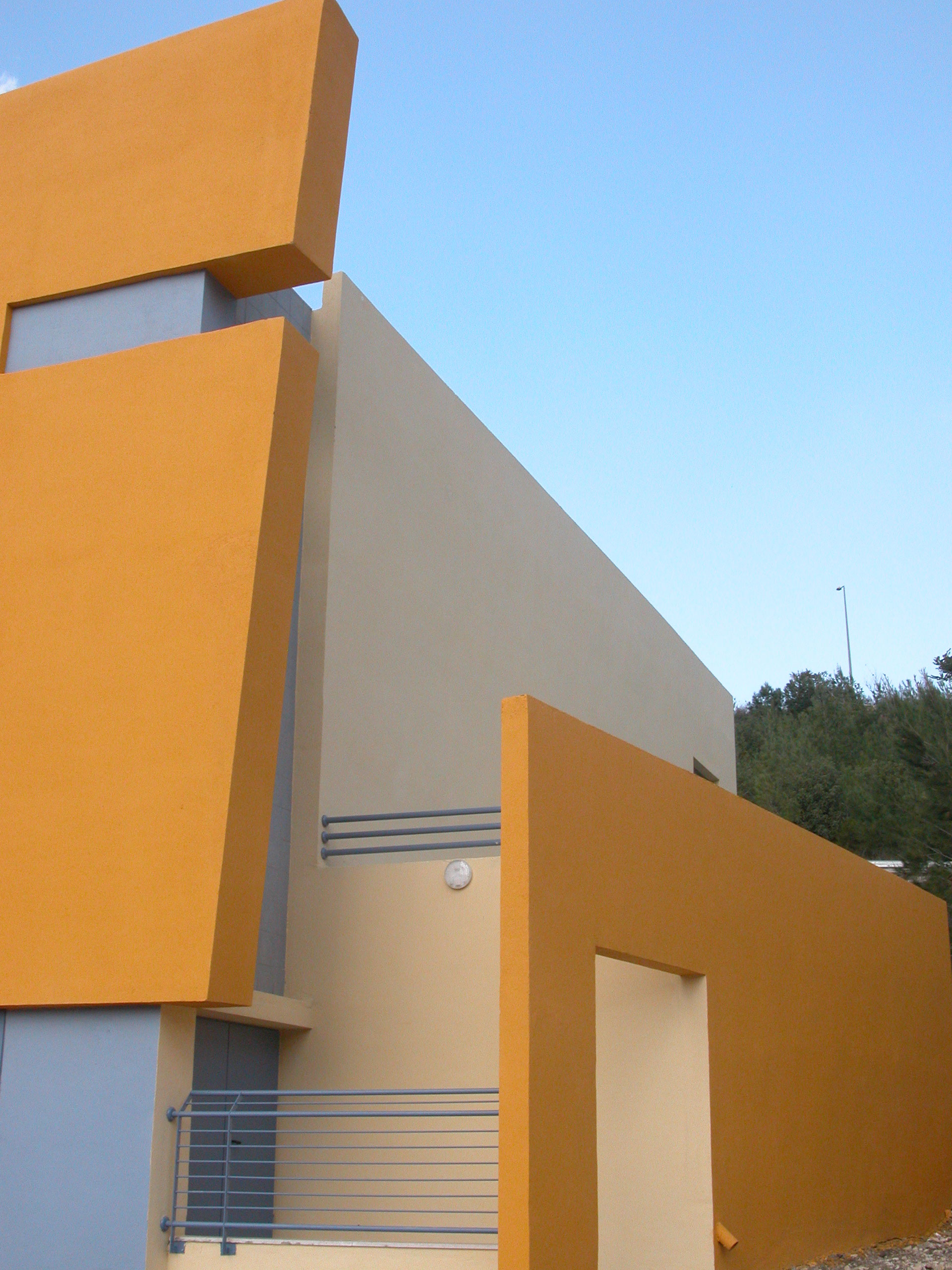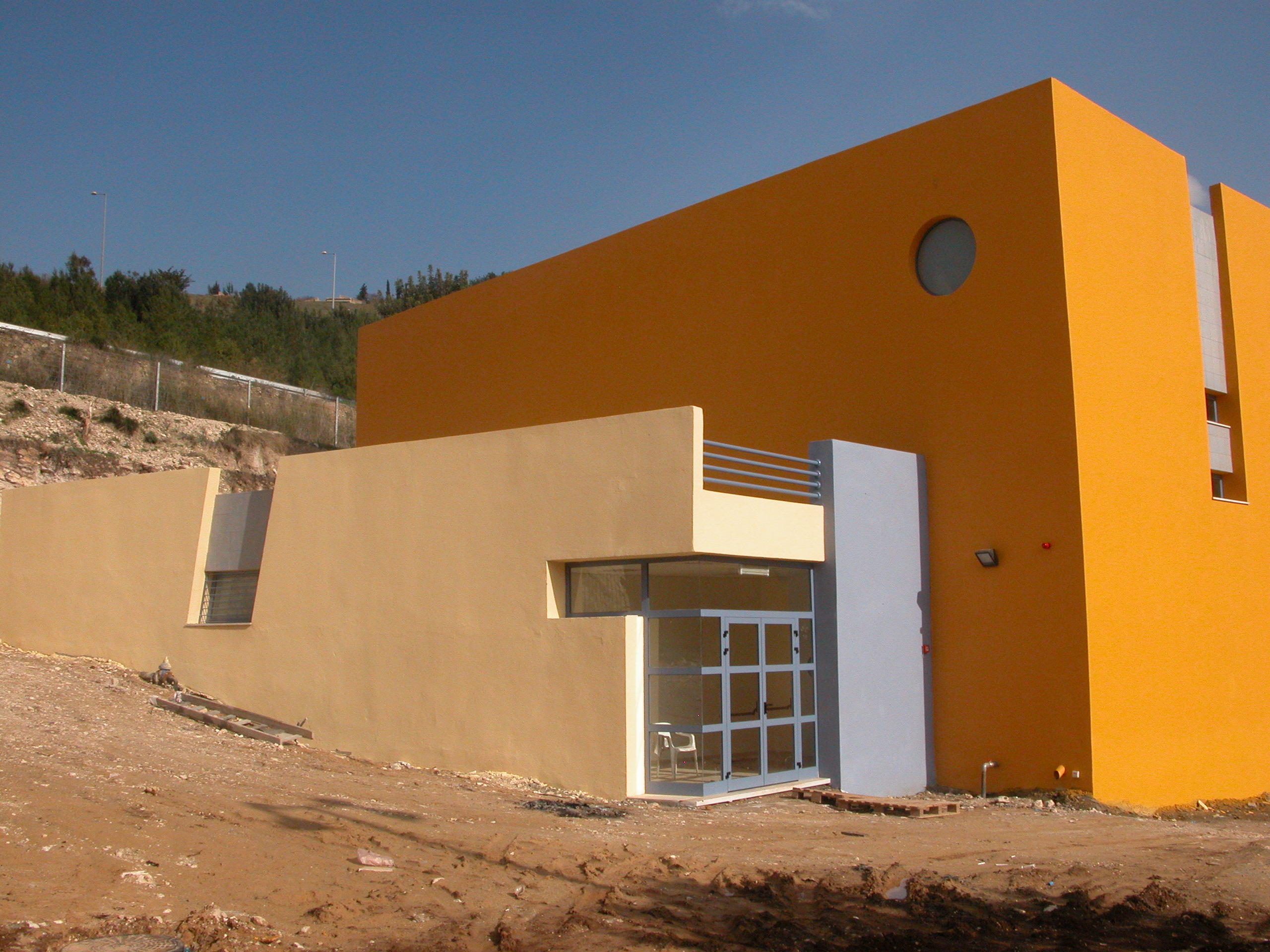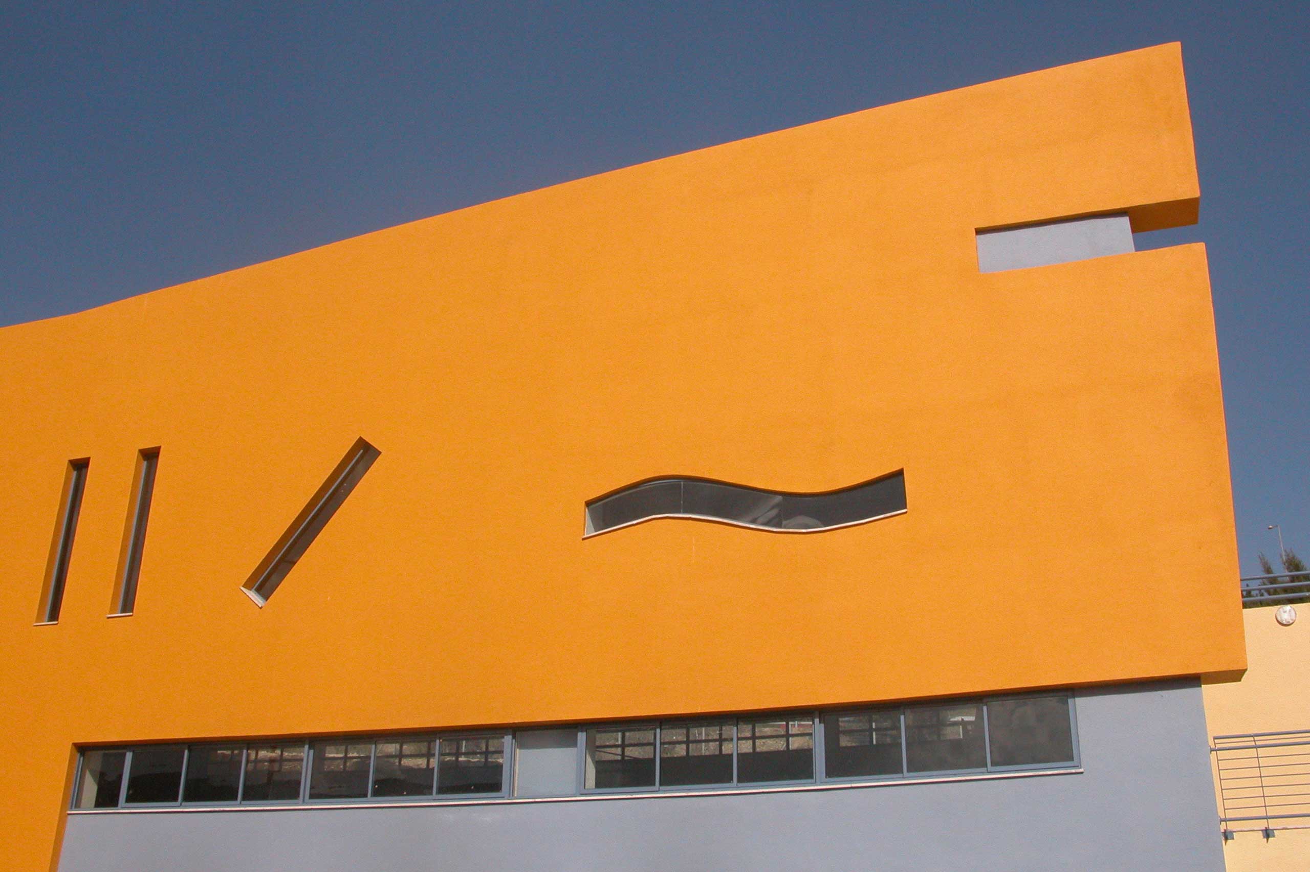 The forms, the colors and the partly disharmonious openings on the facades create an atmosphere of joy, motion and youthfulness. Located on a High-School campus, it serves the students and the community. It is a pleasant place for meeting, playing, socializing and enhancing the connections among people in the neighborhood. It is architecture that pays tribute to the casual side of life in all its human aspects.