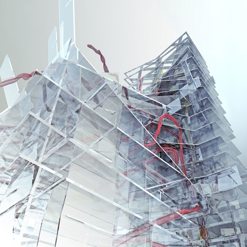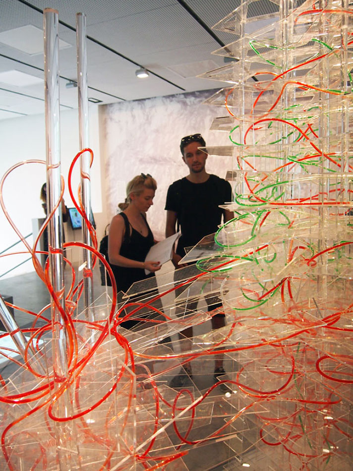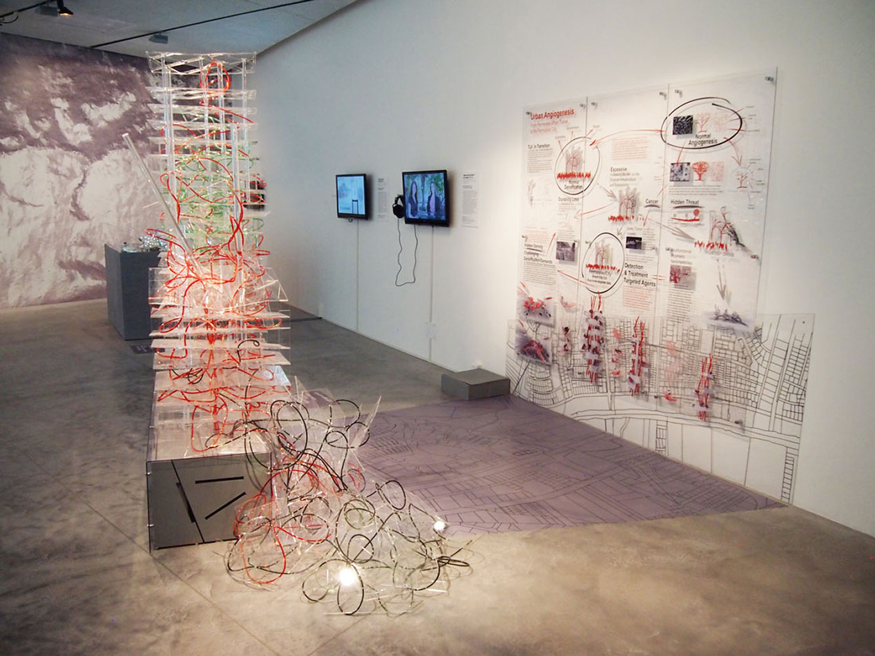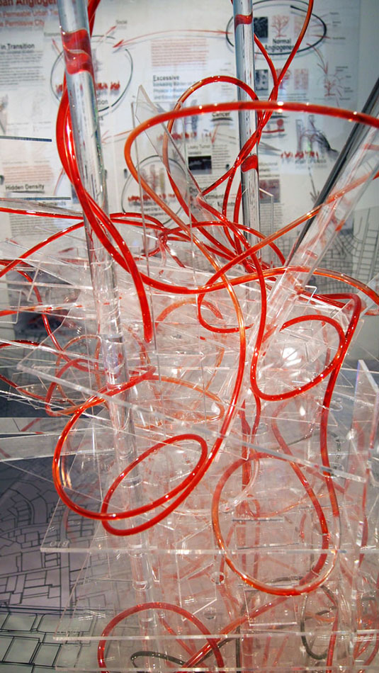 BIO Smart City 3.0 is a dynamic installation whichapplies the biological process of angiogenesis – through which new blood vessels form from pre-existing ones – in order to explore new methods of preventing urban over-densification. The installation consists of two `towers` measuring four and seven feet high, constructed from acrylic sheet. Red liquid flows continually through a series of Polyurethane conduits, intertwining within the two towers, demonstrating a healthy level of habitation. Simultaneously two other systems are working alternately: one showing the healing process of a diseases area in the structure, and the other emphasizing the collapse of an untreated area. The structures allude to the built and unbuilt urban fabric, the shade of the fluid is the identification and treatment of diseased areas due to unattended changes in population density.