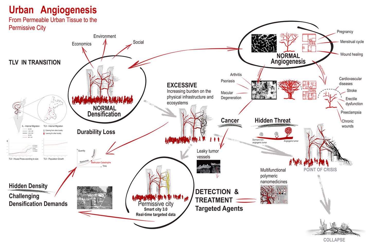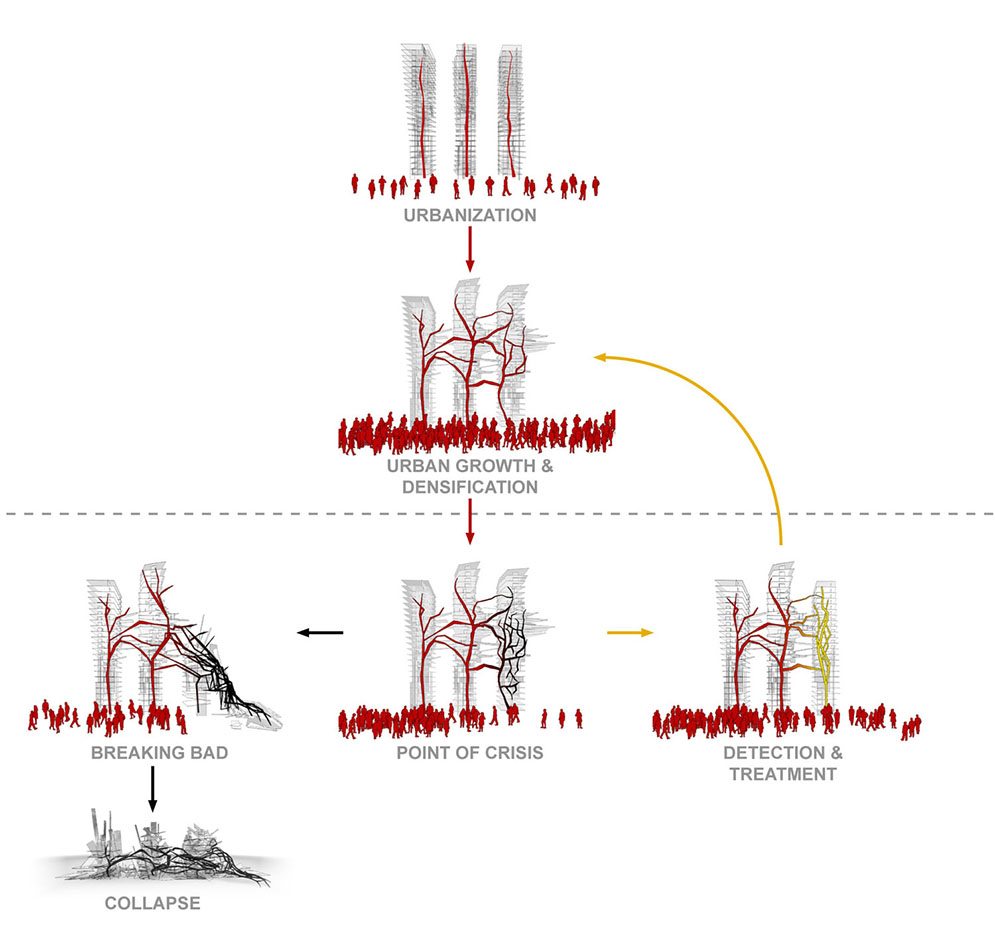 Comparing cancer tumor development with rapid urban growth exhibits similarities in both processes: In both cases if left untreated, infrastructure grows at an uncontrollable pace in order to nourish the new ‘tissue’, both within the biological and urban realms, bringing the system closer to its ‘point of collapse`.