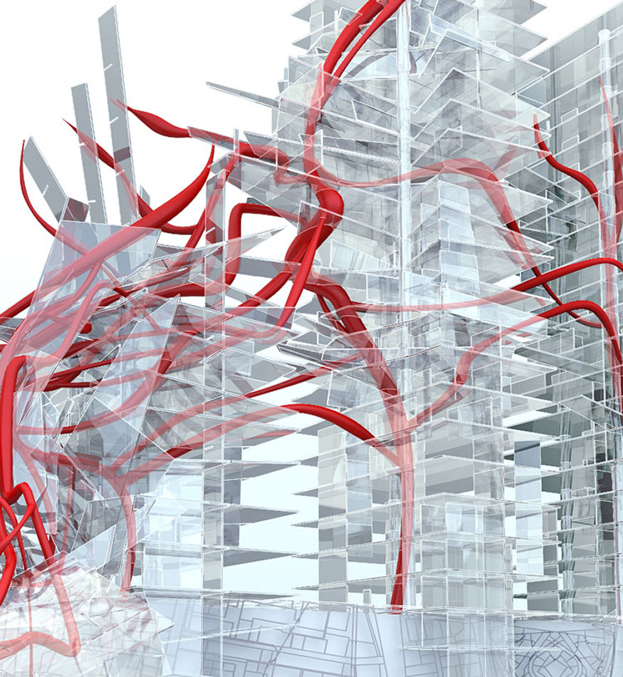 BIO Smart City 3.0 is a dynamic installation which applies the biological process of angiogenesis – through which new blood vessels form from pre-existing ones – in order to explore new methods of preventing urban over-densification